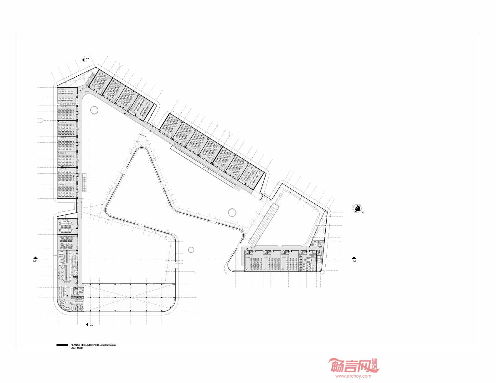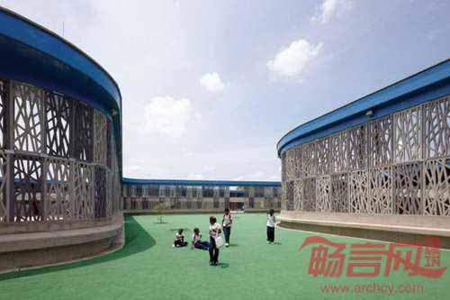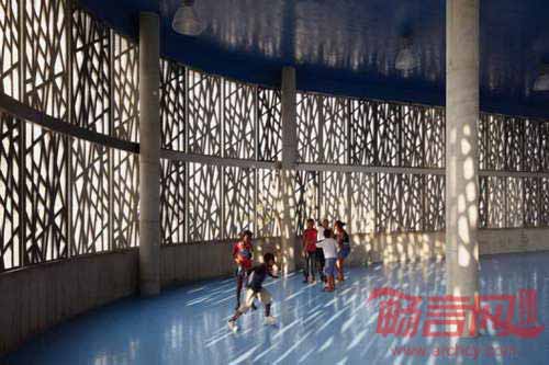 哥伦比亚Flor del Campo教育中心设计围绕四个环形展开,每个厚度不同的环形建筑各有两层,围绕着不同的运动场铺开。建筑外立面和内部区域具有同等重要性,设计灵感来自建筑所在区域的热带植物和树木的形状,使人感受到休闲运动及教育交流的氛围。