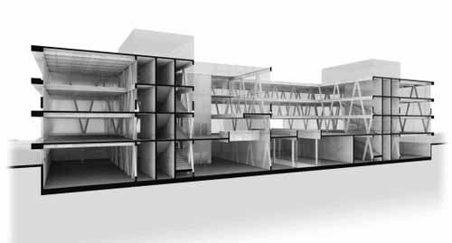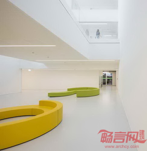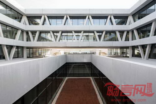大厅面向内部庭院,后者包括新楼和已有WIFI主楼之间的大型广场。这一广场成为核心聚集空间,便于人们进行各种交流沟通。
