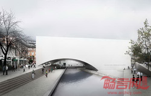 电影院如同庇护所和存放集体记忆的场所,造就了城市历史、湖泊和公共空间之间的对话。尽管地中海遗迹挖掘工程要求拆除一所学校,白色混凝土影院将覆盖考古遗迹上方,以一道和缓拱形结构与地面相接。
