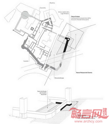 W+W公司设计的影院方案旨在保护16世纪瑞士魏斯康蒂城堡遗产,建筑将同富有特色的滨水场地互惠互利。历史悠久的防御堡垒位于Maggiore湖畔,属于早前较大规模城市综合体规划的一部分。设计方案计划通过部分遮掩人工制品,使古堡墙壁保持完好。