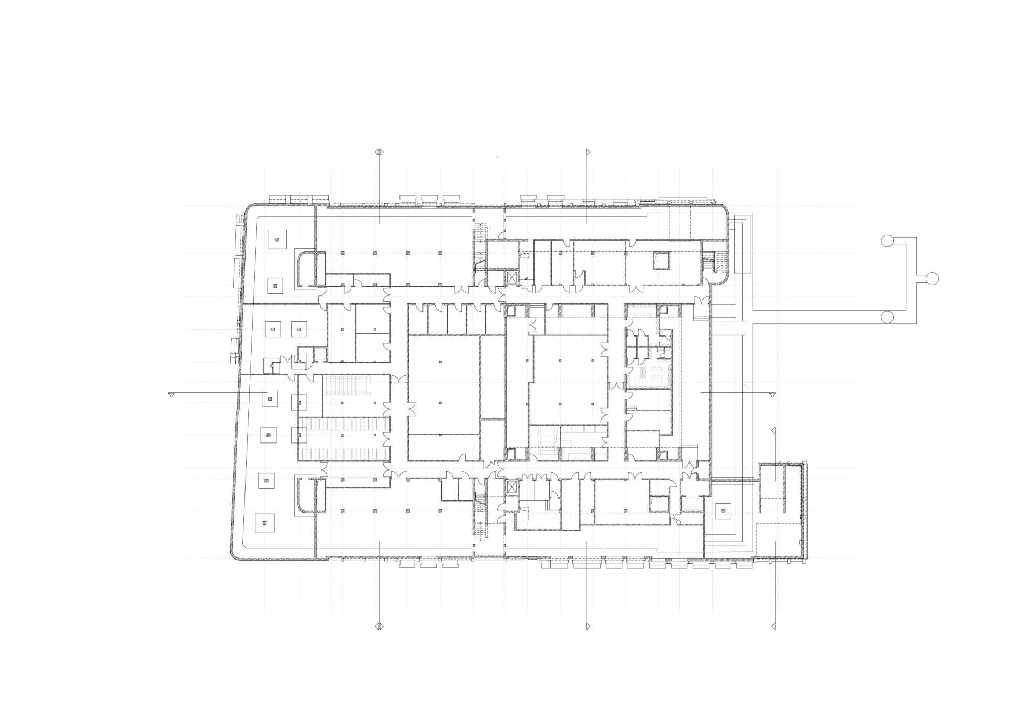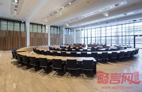 多功能公民论坛向广场敞开,在晴朗的天气,可以通过打开西立面的大门,使空间得到统一。为了营造室内氛围,设计师精心挑选材料,使其颜色、纹理、感觉与空间结构产生相互作用。包括柱子和天花板在内的结构原件均处理成明亮白色石膏饰面。会议室和市长办公室都铺有木镶板。面向中庭的公民论坛地面是透明玻璃板,营造出办公区开放的氛围。