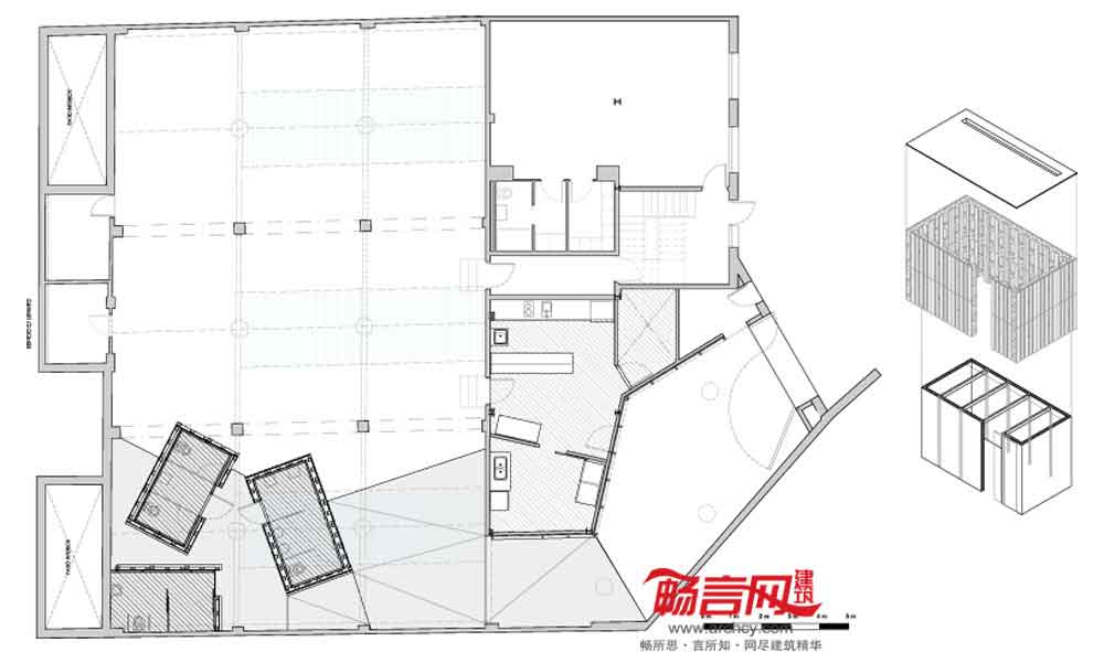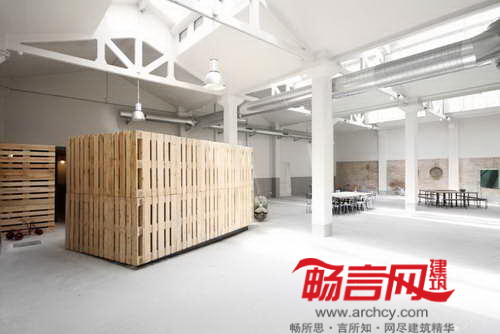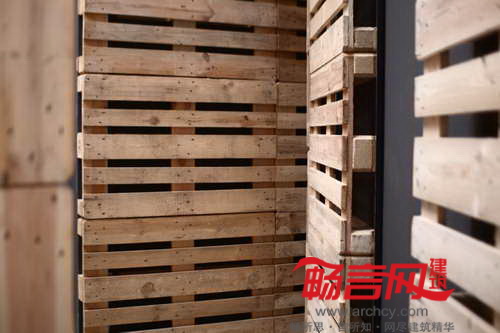 甲方只提出了基本的项目要求,空间内只有三个公共卫生间;正中央设置了三个木头箱。