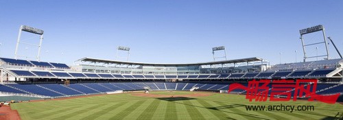 这座新体育场是为与这里的娱乐场地之性质和作为去往郊区的门户而专门设计的,它将是奥马哈市城市发展的助推剂。体育场是基于不同的活动体验而进行设计的:包括学生运动员参加比赛的活动、球迷及观众在不同的赛季参观比赛的活动等等;以及根据体育场作为公共场所而进行的不同活动(包括作为世界大学生棒球系列比赛及它与奥马哈市的关系)而专门设计的。自然光线照亮了这座四周围起来的体育场地,让观众有了更好的室外观赛体验。此外,体育场里的各个建筑之间还有许多小开口空间,透过这些开口,观众们可以看到一个个不同的城市景色,仿若一张张小插图一样。体育场的二楼上还安装了许多玻璃,这使得二楼的观众也可以欣赏到郊区的景色。体育场现代感十足的设计与一层的华丽庄严的外墙和玻璃相得益彰。场馆上还有一个象征性的金属“halo”屋顶,它可以全天为观众提供阴凉。