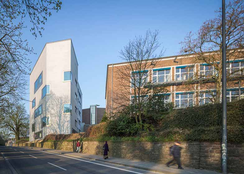KSG建筑事务所设计了位于德国西部的亚琛工业大学化学实验楼。建筑共有六层,容纳了化学系,占据了城市中央校区的一块边角场地。建筑外立面设计思路是符合周边环境,同时起到出挑效果。尽管在尺寸体量上无异于其他建筑,通过灰色材质墙面和闪耀的金属窗框,实验楼显得与众不同。设计师表示,“第一眼望去,实验楼有些孤立。然而,它丰富奇特的形状恰到好处地与城市规划条件相符,并通过对材料品质和外立面颜色的精确把控,保持了环境一致性。”