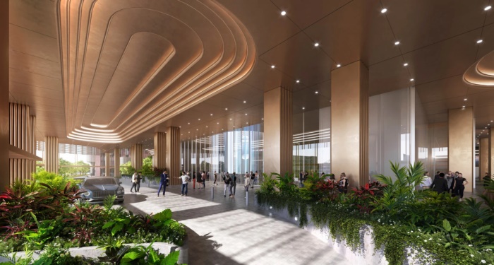 这座 63 层高的摩天大楼的设计展示了一个阶梯式结构,从一个种植满植物的基地升起,沿立面有一系列的空隙,被设计成类似于“竹林”。