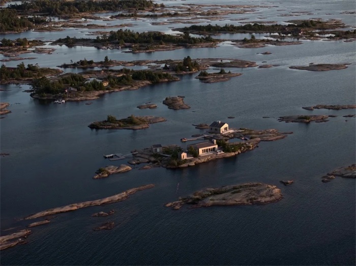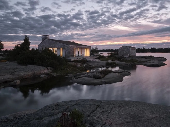 本项目由一系列小屋式的建筑体量组成,每座建筑都与这个一英亩的小岛构成和谐的比例。四个建筑体量均采用了沥青屋顶,屋顶上覆盖着被风化过的银色雪松瓦,瓦片宛如在风中摇曳。在一定的光照条件下,银色的屋顶就会完全融于周围的棕灰色岩石中。主屋坐落于最高海拔处,卧室、桑拿房,以及包含健身室的小屋则坐落于不同的小丘之上,体量之间由木板舷梯连接。这些舷梯连接着每座小屋的着陆点,并填补了岩石之间的空隙。
