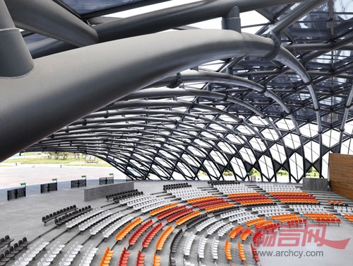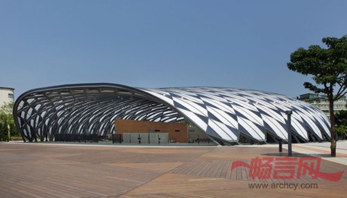 展览为所有的参观者提供免费座位,这个区域位于依据目前地势打造的由钢筋混凝土建造的折曲地段。展馆室内的天花被覆盖多种图案的马赛克瓷砖,同时外墙表面以混凝土装饰,用专用模板印制上松球状微粒。