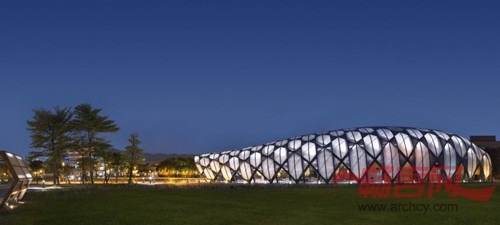 为了保持尽可能多的观看点畅通无阻,建筑高度一直维持在最低水平。礼品商店的展馆由六个花瓣形状组成,包括三个一层和三个两层的单元,并且没有外围结构。每个单元都是悬臂式的,由三角形和六角形构成的单个中央轴组成,同时多孔的竹子编织遮蔽网络成为外形的唯一分界线。