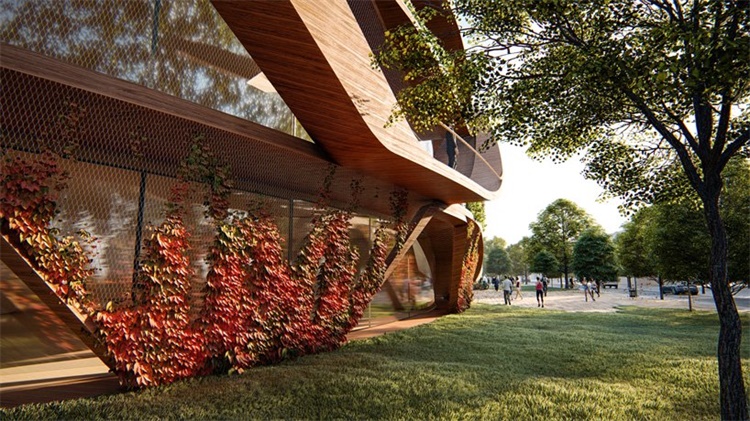 有机建筑中心是一个广场,内部设有核心设施,饮食区和运动区。宽敞的楼梯连接建筑物的两个分区。建筑师设计了这座三层校园建筑,采用承重木结构和高度隔热的玻璃墙面,可以提供充足的自然光线。