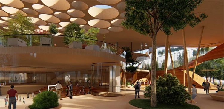 LAVA基于美国未来主义者David Thornburg的空间类型学概念,并考虑了learnlife教育模式(由目标激励和个人学习驱动的组织)。设计灵感来源于自然元素:波浪、细胞、树枝和巢穴,应用于布局、结构系统、天花板和绿色植物。不同元素通过起伏的阳台、螺旋形梯田、蜂巢天花板和嵌入式绿化来表达。