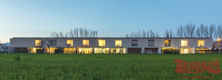 Murmuro的小憩住宅位于葡萄牙北部布拉加城郊,周边正在经历从农村到城郊的开发。起初,开发商计划建立9栋大尺寸的独立住宅。不过,2008年房产危机产生了对于成功开发的疑虑,随后年轻的建筑师受命重新构想方案,完成了全然不同的策略。新方案包含12栋相对较小的住宅,价格亲民,更容易被年轻业主接受。这一理念反应在设计变化中,设计师将停车场改在地下,并在地下设置了停车场入口,将所有车库连接起来。场地另一边设有入口坡道,垂直核心结构满足安全规范,解决了紧急出口和整体出入需求。