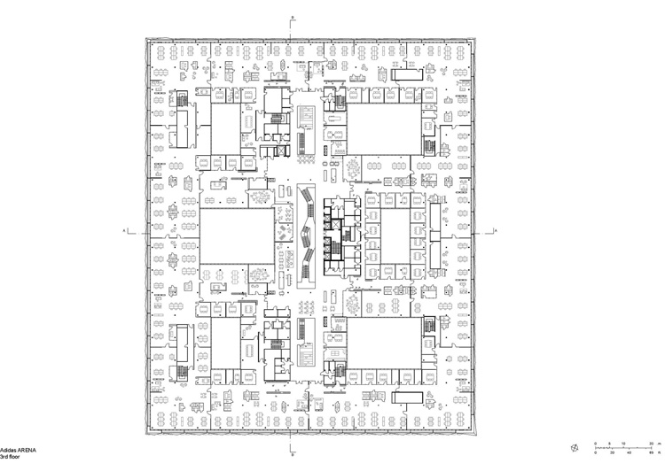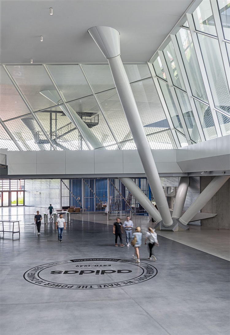 “竞技场”是紧随去年完工的“半场(Halftime)”大楼建成的,这两栋建筑一共花去了阿迪达斯超过3.5亿欧元。“竞技场”更多关注未来革新,“半场”则更专注于员工的休息时间,这也是名字的由来。这里有运动主题的会议室、可以提供2000份餐食的员工餐厅,还有室内的足球场、沙滩排球场、跑道、健身房等设施。