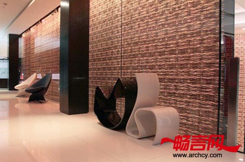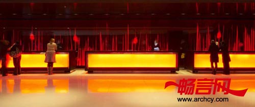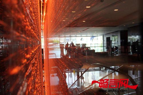 这两座玻璃墙长12米、高8米,它们会在一天中不断变换颜色,连同位于前台后面的玻璃艺术品一起,来不断变换这里的格调和氛围 --- 无论你一天中几次经过这里,它时刻都会给你一种新奇的感觉。从宾客踏进这里开始,这里整体的格调就不断变换着,并且一次次的为宾客创造出不同的视觉体验。