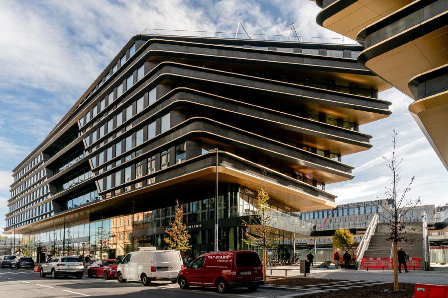 由扎哈 · 哈迪德建筑师事务所设计的这一办公和零售综合体位于火车站台的北边,占地面积约 28000 平方米,由两栋大楼组成,东边一栋共 7 层,西边一栋为 9 层,1 楼和 2 楼都是零售空间,3 楼及以上为办公空间。