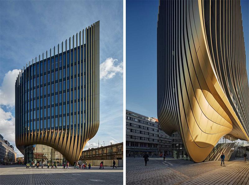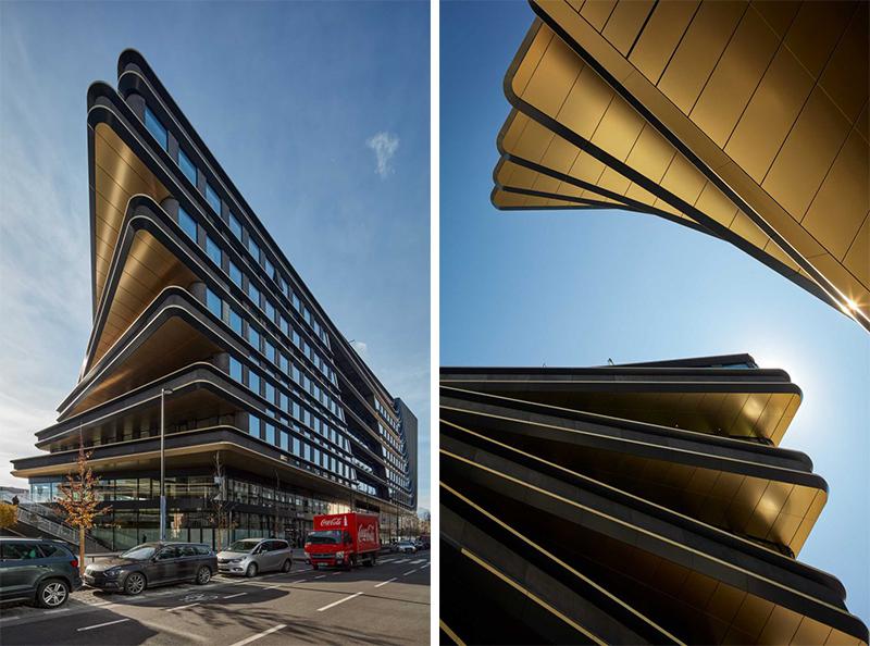 两栋大楼采用了流动的线条造型,整体横向的线条在西侧一端转向,往上延伸形成如同金色尖塔的结构,西立面由一片片的翅状结构组成,设计上体现了扎哈 · 哈迪德事务所一贯的风格,同时也呼应了布拉格 " 金色之城 "、" 百塔之城 " 的称号。