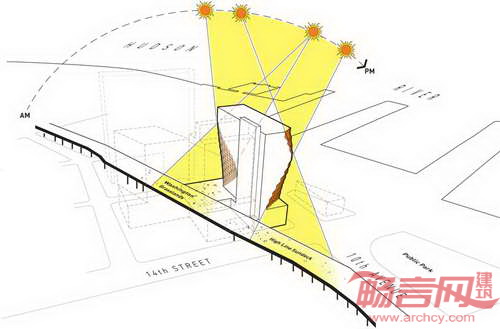芝加哥Studio Gang工作室公布了纽约Solar Carve住宅楼室内外设计形象。这栋玻璃结构住宅大楼一侧是闻名遐迩的由火车道改造的高线公园。高架线性公园已然成为城市改造和工业空间回收项目范例,本住宅项目再次证明可持续性设计方案能够产生建筑创意。住宅楼将传统分区重新界定,形成具有雕塑感的结构,使建筑元素为公园添光加彩。由于场地东侧是高线公园,项目依照太阳光线运行轨迹设置的缩进。