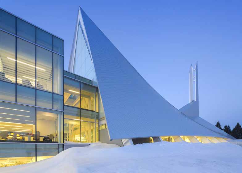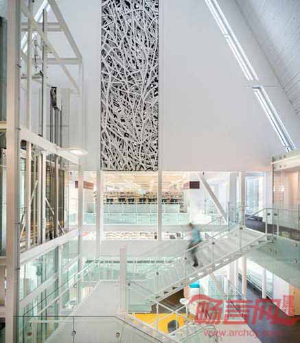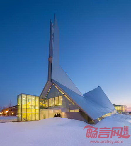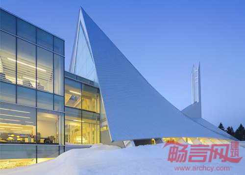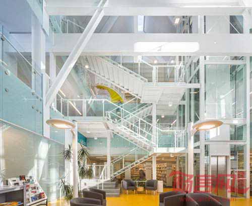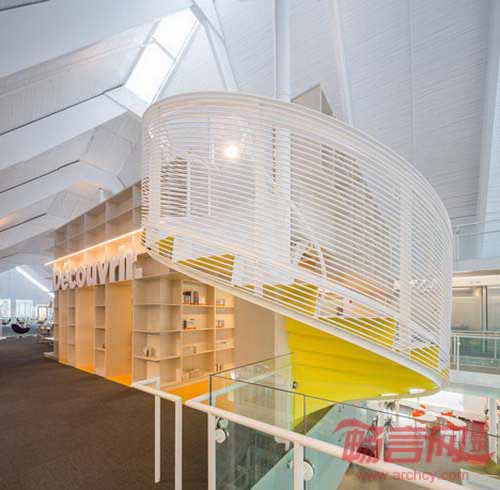 加拿大Dan Hanganu工作室同Cote Leahy Cardas建筑事务所合作共同将魁北克一座帐篷形状教堂改造成现代图书馆。图书馆具有彩色釉面玻璃、螺旋楼梯和挑高天花板。St. Denys-du-Plateau教堂建于1964年,以高耸的尖顶形象矗立在城市中心。项目完整保留了交通结构,在两端添加了两座玻璃建筑物。项目被命名为“Monique-Corriveau图书馆”,名称用来纪念一位当地作家,地上两层和地下一层空间目前容纳了公共图书馆和当地社区中心。访客从建筑两倍层高的中庭进入室内。中庭位于原先教堂正厅之中,引领读者来到阅读区和阅览桌。