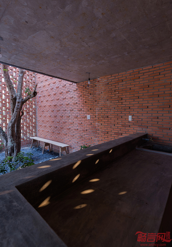 房子的前后院充当了缓冲区的功能,这样可以降低外界环境高温的影响。前院可以进行一些休闲活动,比如在早晨喝一杯咖啡,在这里,自然风、阳光和砖墙斑驳的影子交织在一起。