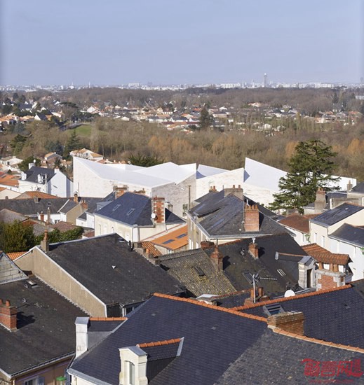 Fernandez & Serres公司完成了位于法国南特的文化中心。项目设有灰白的石砌墙面和坡屋面,对周边住宅做出回应。项目名为Cour et Jardin,坐落于南特市郊的Vertou,涵盖剧院,录音棚,音乐舞蹈排练厅。为了减少建筑的视觉尺度,设计师将其分成一系列小型结构。建筑上方设有统一的坡屋面,其角度朝向不一,恰好和周围的房屋相符。