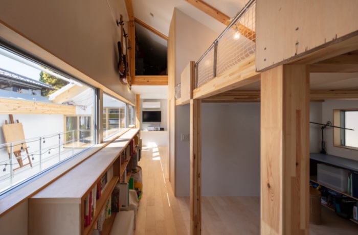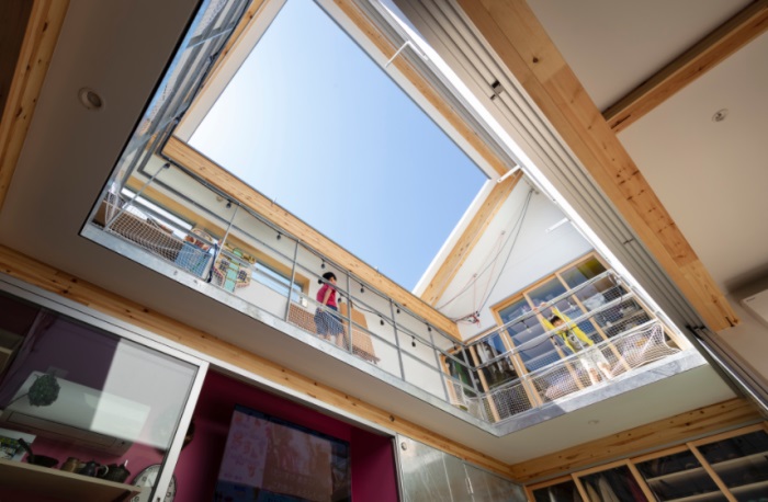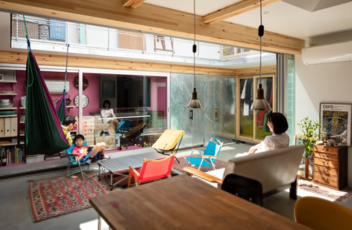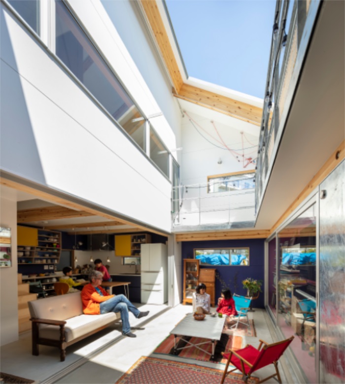 在日本,房屋只有被屋顶覆盖的部分才被计入面积。因此业主选择了一个未知但大胆的选择,家中一半的空间都不设屋顶。因此包括起居室在内,这个住宅一半的空间都直接与外部环境相接触。