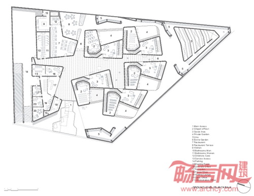 建筑有两个主要功能,其一是为逝者的最后告别仪式做准备;其二是容纳出席告别仪式的人们。由于功能不同,空间包含了两层——地下层用于前者,一层是连接办公室、咖啡厅、花店、护理室、休息室和问讯台的空间。