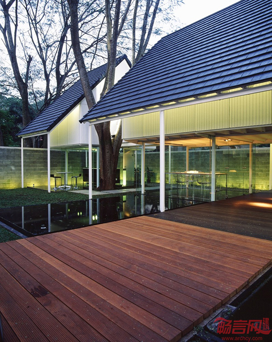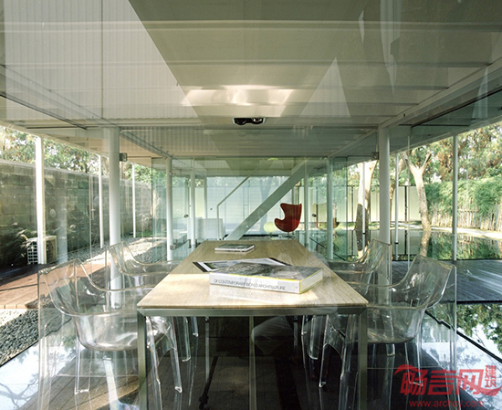 宽大的倒影池与建筑的两侧紧密相接,一个木质平台横跨整个场地,将其分为两部分。一楼是一个双层高的工作区域,穿过平台,有一个小会议室。一楼的外墙采用玻璃制成,在池水倒映下,显得室内空间增大了一倍,整个仿佛工作室“漂浮”在水面上一样。