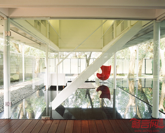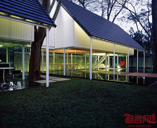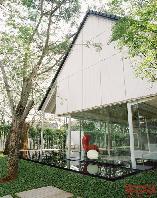 在印度尼西亚首都雅加达以西12英里处的一座郊外卫星城里,有一间“漂浮”的工作室,周围是方正的围墙,院内有许多原本就生长在这里的树木。这是一间供10位建筑师使用的工作室。