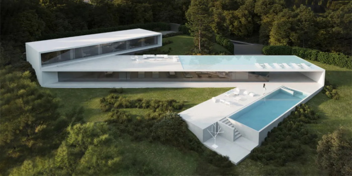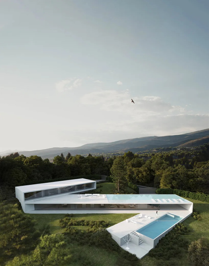 95号别墅提供1200平方米的起居空间,包括六间卧室、一间私人服务式公寓和双厨房,一间用于日常使用,另一间用于辅助。该设计兼顾休闲和生活方式,并融入了设施齐全的水疗中心、多功能厅和健身房。户外,波光粼粼的泳池和简约的倒影池进一步提升了房屋的雕塑感,同时营造出放松和沉思的空间。
