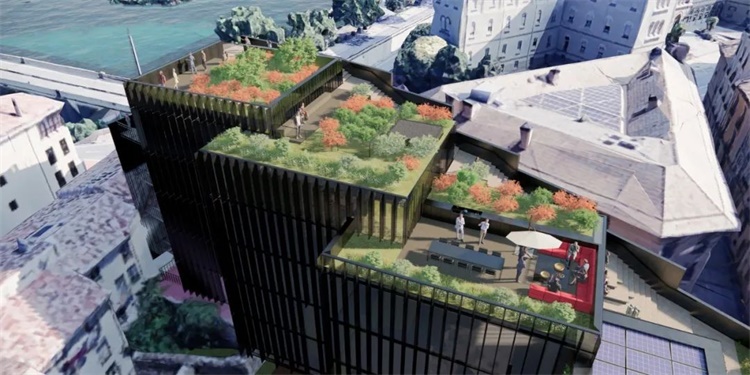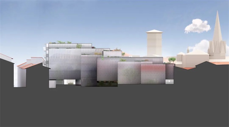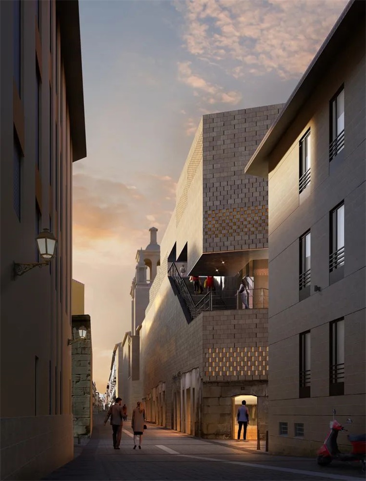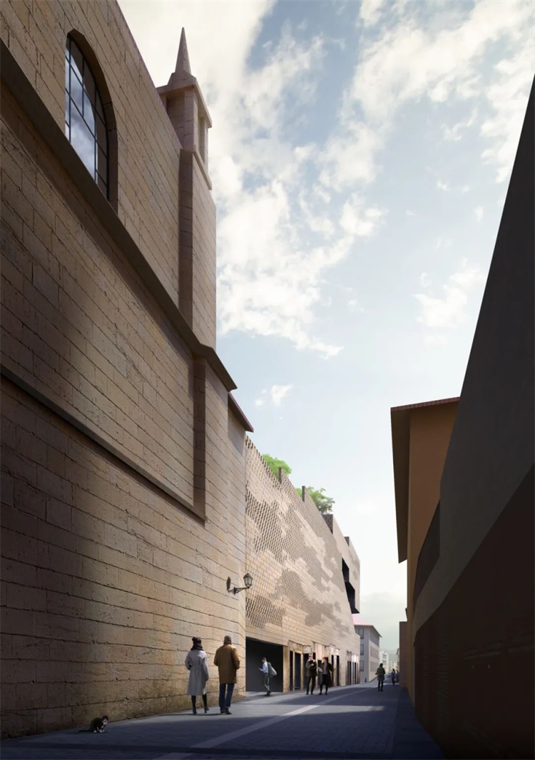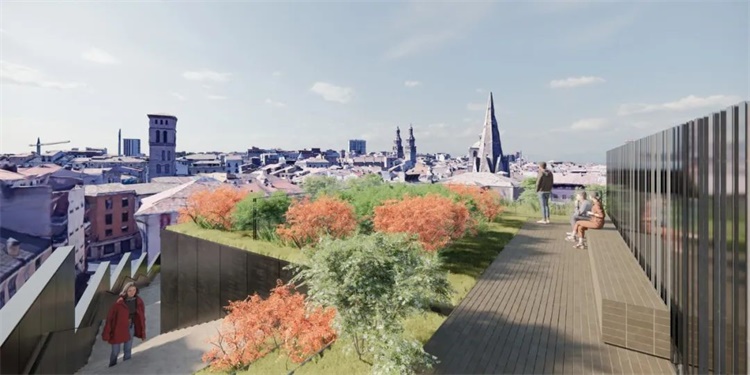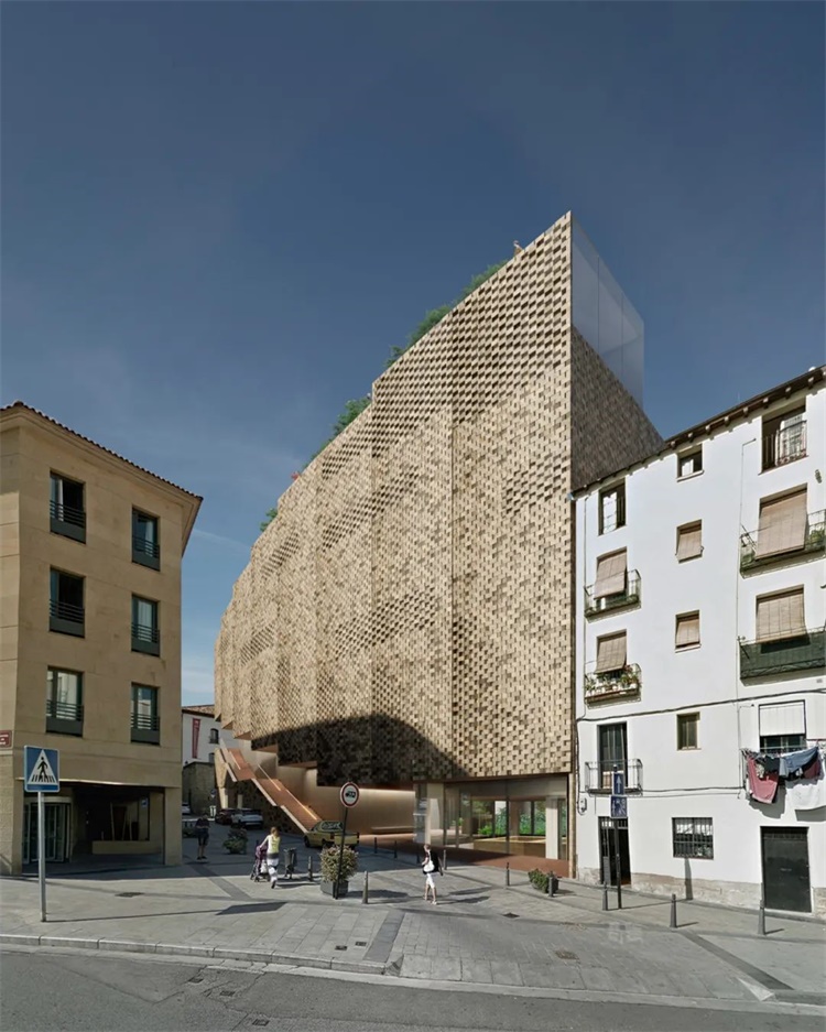 这个庭院区并不是唯一一个被规划为公共空间的区域:由于高度的落差,建筑屋顶将是人人共享、拥有不同城市风光视野的绿色空间。此外,该项目毗邻石桥的战略位置使建筑师考虑与通往洛格罗尼奥的圣雅各之路(Camino de Santiago)建立潜在的协同效应。