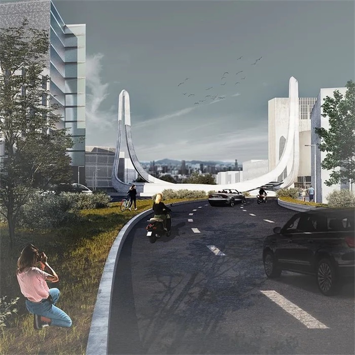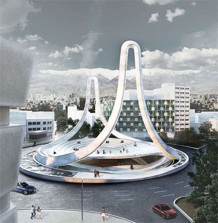 设计理念借鉴了伊朗建筑的古老实践,即用实心的体积平衡空白空间和空隙。重新定义现有广场的形象和概念,并赋予其新的内涵,以现代设计唤起历史悠久的波斯广场的概念。将环形交叉路口转变为繁华的社交空间,展馆的形状为一系列向外扩展的同心环,并以流畅的运动从地面出现,在边缘形成两个巨大的横扫山峰。在边界内,阶梯式楼层创造了一个封闭的空间来举办各种社交活动,社区可以聚集在以前是城市空白的地方。