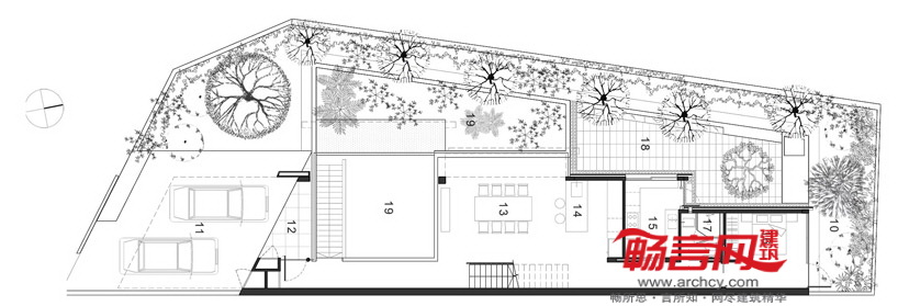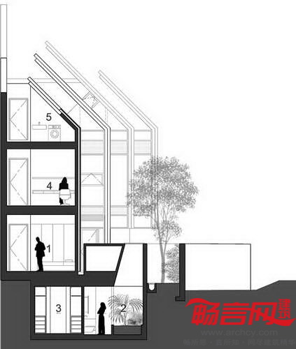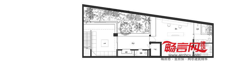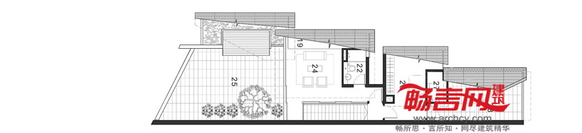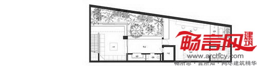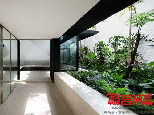 设计师给出的解决方案是使用四块折板真正将外界干扰隔开,并维护室内空间的私密性。住宅带有一个地沉式的花园,给主要生活区提供了宜人的植被。