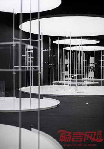 为了符合相关规定,设计师希望隐藏展览中的绘画、照片和人工制品。设计师创造出一系列明亮的圆柱,并称其”令人联想起烟圈或巨型香烟“。