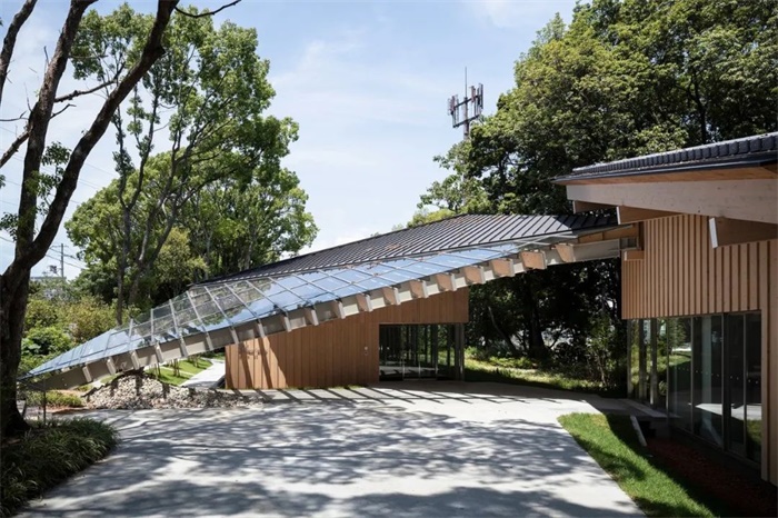 瓦片集成型太阳能电池、透明太阳能电池和绿色屋顶与多面体屋顶融为一体,将不同的环保技术附着在屋顶的不同侧面,赋予屋顶不同的表现形式。建筑采用了 Kaneka 的多项环保技术。例如,在这些中型建筑中采用了 Kaneka 为独立式住宅开发的木结构外绝缘和双重通风方法,安装了根据室外气温改变通风路径的系统。