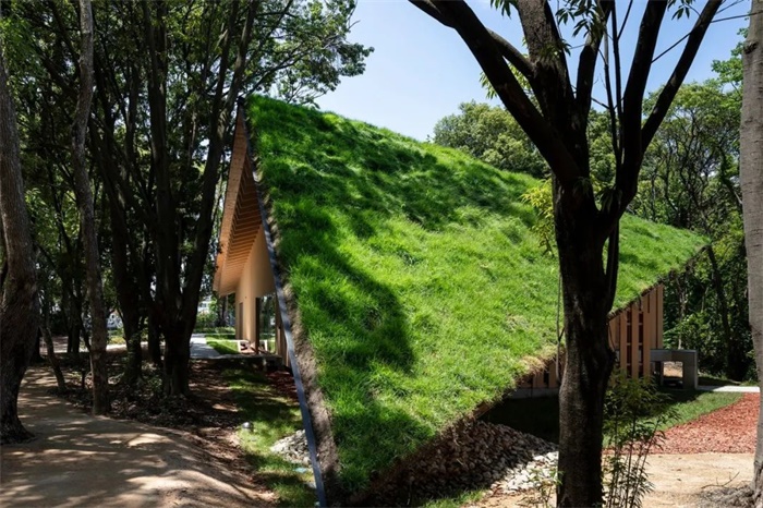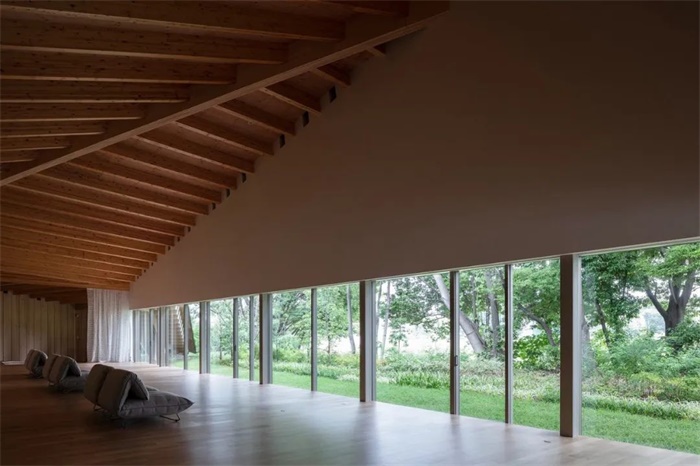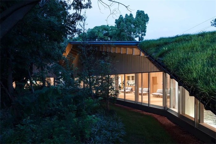 在对现有树木进行 3D 扫描以创建数据从而确定其位置后,砍伐了树木(主要是外来入侵树种),以保留适合该地区的树种。从地面延伸的多面体屋顶覆盖着建筑,使建筑与森林融为一体。