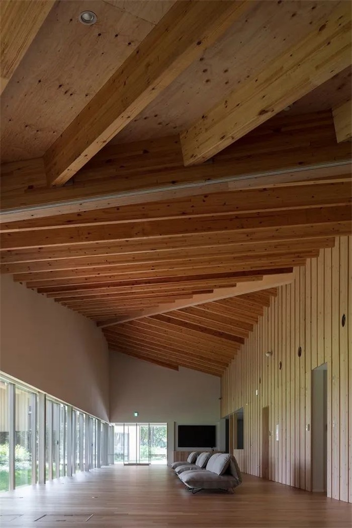 深屋檐和出色的隔热性能还有助于实现能源平衡为零的 Net-ZEB。该设施竣工后,被用于开展烹饪班和运动会等提高健康意识的活动,以及帮助员工恢复疲劳的休闲空间。该设施因其注重健康的功能和设计而获得了 IWBI 的 WELL 白金认证,例如室内使用了大量木质材料,透过窗户可以看到丰富的绿色植物。