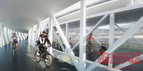 河畔公园的自行车道一直通向场馆,并沿着建筑外围盘旋上升。主要的两个坡道受到半透明钢丝网表皮保护,环形上升并在建筑顶部形成一条连续流畅的道路,自行车道的总长度是3.5km。无论从场馆内外,都能透过建筑表皮看到自行车运动参与人员。