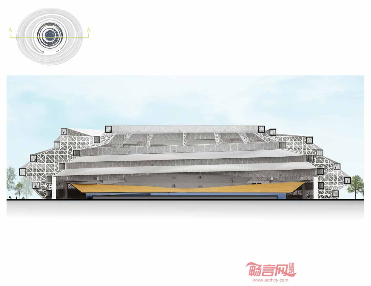 在场内自行车道区域,人们能够享受观看职业自行车运动的乐趣。设计师希望能使业余和职业自行车运动世界相互了解,加强两方面运动的发展,并激发公众参与自行车运动的兴趣。场馆表皮是城市肌理的延伸,为城市提供了一个具有活力的公共场所。