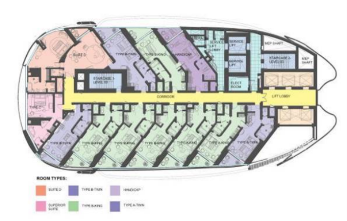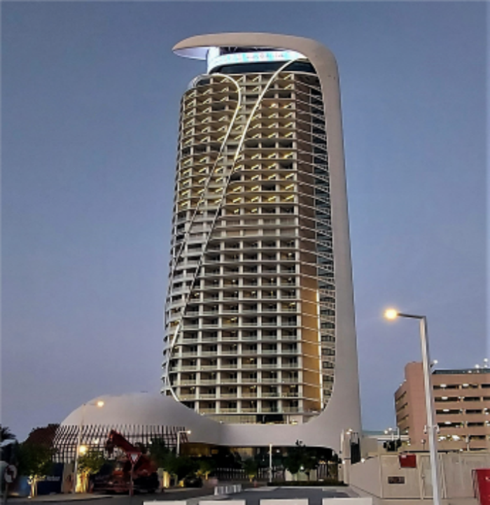 每间客房的转角犹如羽毛编织的纹理,延伸了建筑的空间体验。塔楼顶部采用两艘倒置的独木舟形式,突出航海主题。钢结构铝板外墙在迪拜阳光的照耀下闪闪发光,营造出海市蜃楼般的视觉效果。