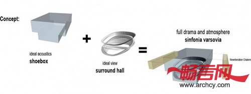 音乐大厅是鞋盒子大厅和竞技场建筑的融合体。传统的鞋盒子大厅有很好的声音效果,但是视觉效果却不佳,而竞技场则恰恰相反,它有好的视觉效果但是声音效果却很差。
