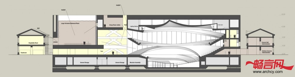 交响乐大厅里面包含了所有的彩排区,它们都围在浮墙里面。浮墙悬于门厅高度之上,这样公园就能深入到建筑立面,让建筑成为公园的一部分。而建筑立面又有很多奥秘:隐形的房间和楼梯、楼顶小径、和横跨140米、却没有一根柱子支撑的建筑。
