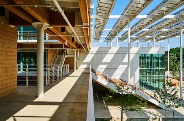 Fifth + Tillery重新发掘现代办公空间的潜力。整栋建筑的色调有意地向实用性和自然性靠拢,混合木结构系统为空间内绿意盎然的景观增添了一抹暖意和美感。Fifth + Tillery专注于可持续发展和社会福祉,通过屋顶安装的太阳能电池板来满足建筑内的电力需求,还设计了一条水道,可收集雨水用于灌溉。建筑与大自然的无缝融合吸引着用户进入公共空间,营造了一个鼓励交流联系和自发协作的动态社交环境。