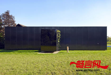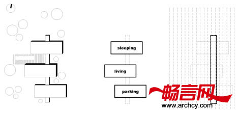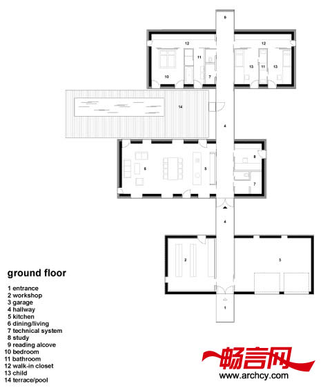 不同的功能区被安排在三个类似于集装箱的房子里。从街道上,你会看到住宅的院子里有一条铺设好的道路,沿着这条路走,便可以到达房屋里面。道路一直连接着住宅的玻璃走廊,最后延伸到住宅后面花园出一个悬空的房间下面。第一个“集装箱”是住宅的车库和仓库。连接着车库和第二个“集装箱”的通道则是住宅的走廊。而第二个“集装箱”则是起居室,自然光线从三面照射进这里。菜园紧挨着住宅的厨房。