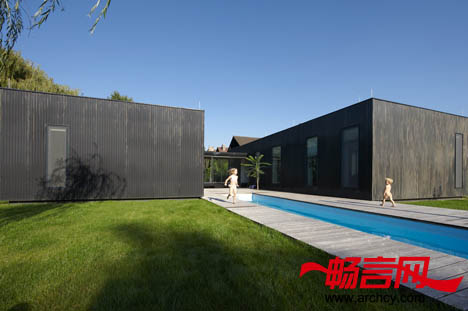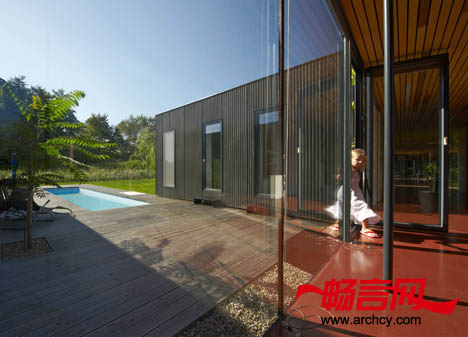 室外露台和方形泳池位于后两个“集装箱”(起居室和卧室)之间,因此它的周围都被环绕着,隐私性很好。从厨房、起居室、走廊和大人卧室都可以进入到这里来。