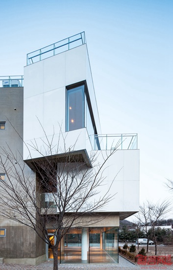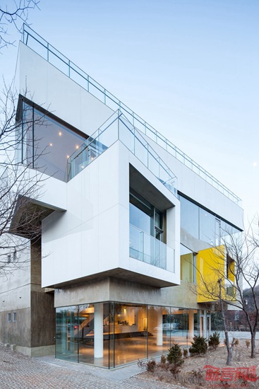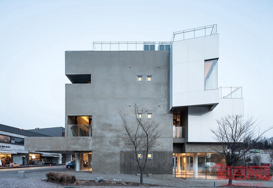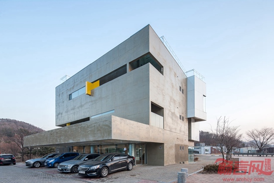 Koossino工作室设计了位于韩国首尔的Maxcube创意工坊。这是一座混凝土建筑,设有白色和黄色的凸窗,坐落于市北的建筑成为艺术家社区办公空间。项目理念是“咖啡文化空间”,位于Heyri文化村,由由作家、画家、演员、建筑师、音乐家组成。建筑容纳咖啡厅、画廊、办公室,对象是创意团体的会员。