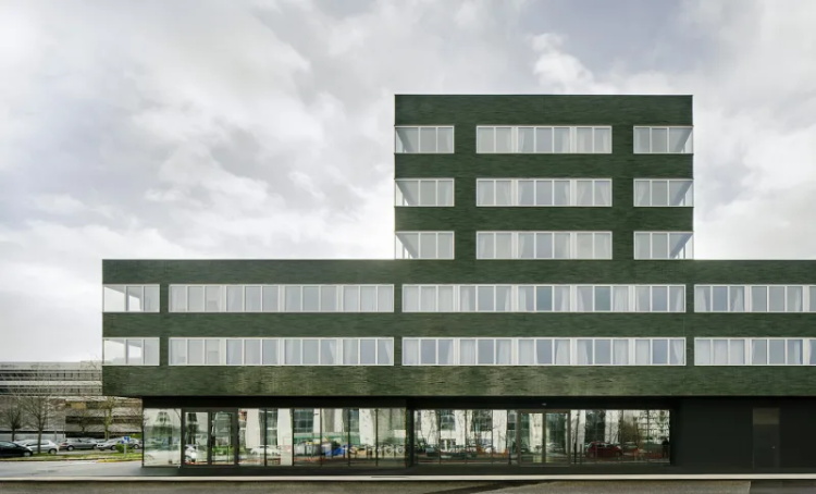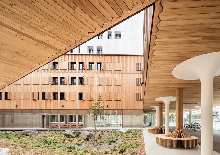 在立面设计方面,建筑师试图创造同区域多建筑类型共存状态之间的联系。建筑一侧面向巴黎国际大学城,通过创造多变的横向材质外立面,融入了周边的建筑环境。一层玻璃立面营造了轻盈的氛围,上方三层空间设有松木饰面,顶层装饰了穿孔铝板。