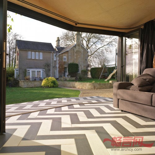 该建筑坐落在一个混凝土台面上,上面铺着黑白相间的V形图案瓷砖,高出花园的地平面形成了一个车库入口、一个花园台阶和一个阳光露台。