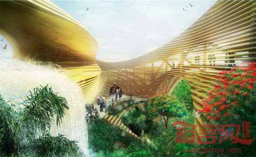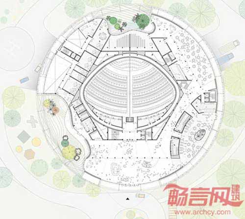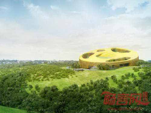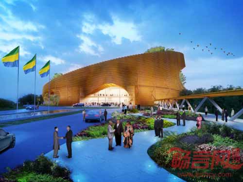 这个新地标项目预计将于2013年2月破土动工,于2014年竣工。设计方案规划了一个集会议、集会、餐饮设施为一体的庞大项目,项目围绕三个雕刻庭院,各庭院代表加蓬丰富多样的生态体系。圆形遮阳结构上方是一个倾斜角度较大的坡屋顶,周围是繁茂的青山。会议厅的坡屋顶成为了建筑最为醒目的立面,从屋顶向上看是城市风景,向下是庭院花园。