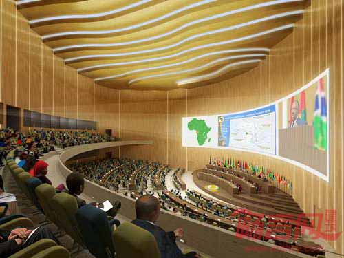 新会议厅保留并重复使用了早前场地上的会议中心的结构元素。由非洲石灰石支撑的百叶结构包覆了整栋建筑,起到了遮阳效果,并为庭院创造了一个垂直景观。庭院机构具有自然通风、制冷和排烟的功能。坡屋顶机构能收集雨水,并形成瀑布景观,继而在整栋建筑中回收循环。