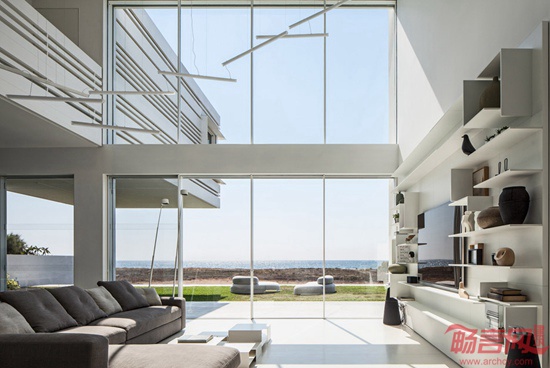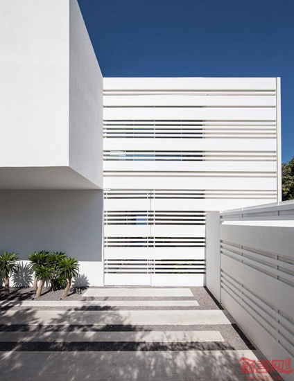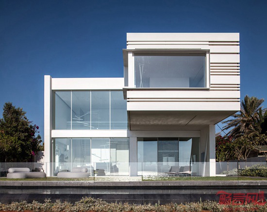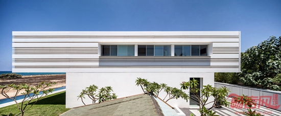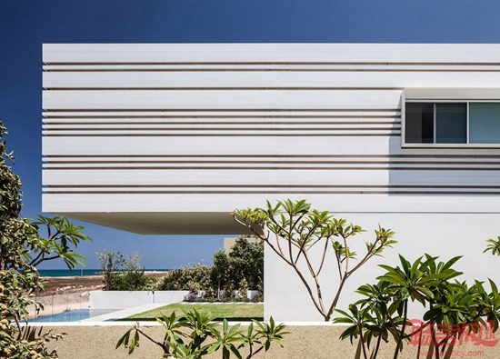 Pitsou Kedem建筑事务所设计了一座海边住宅。建筑二层采用悬挑结构,突出伸向地中海方向。外立面设有水平凹槽,勾勒出美观的阴影。业主夫妇有三个孩子,委托设计师为其位于以色列北部村庄Shavei Tzion,临近业主位于工业区的厂房。场地距离大海仅有70米,之间有一块灌木林。项目设计希望凸显房屋同海洋形象和声音之间的联系。
