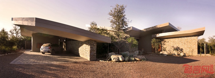 Architects Justice事务所的建筑师Granicki完成了一个不同寻常、充满创意的度假住宅设计,他得到了业主的合作,后者立即对其方案表示认可。该项目位于南非Mjejane私人禁猎保护区,周边的环境证实了挑战的独一无二,中空的屋面不能有敞开或入口,否则不同种类的动物就会占据建筑,同时要采取措施,阻止疣猪在北侧的木质露台下方栖息。房屋的“王冠”是一个漂浮的钢铁屋面,遮盖了房子的各个方向,突出长度达到了最小值,仅有1.6米。而屋面伸出的最大值达到了令人惊叹的13米,悬挑以无支撑的状态呈现出蝴蝶般的优雅。总屋面面积达到450平米,而建筑总面积达900平米,室内区域同室外轻而易举地实现了融合。